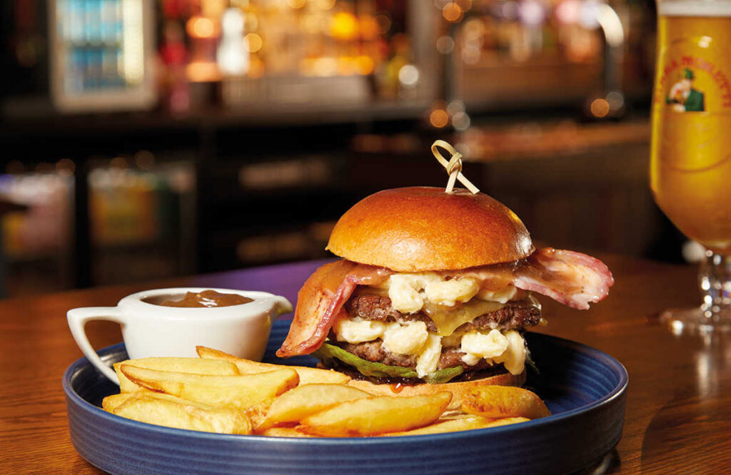 3oz cheese burger, 3oz beef patty, smoked cheese and burger sauce in a toasted brioche-style bun, with skin-on chips | 8.79 1177 kcals